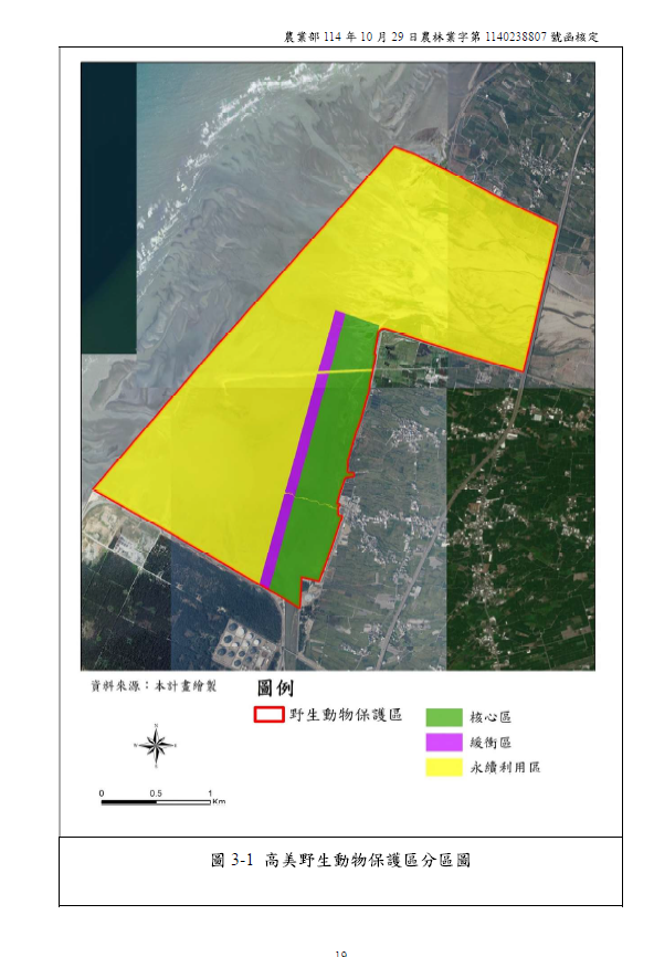 (一)核心區:自番仔寮海堤、高美一號海堤、高美二號海堤往外延伸400公尺之草澤區域,解說木棧道及美軍越戰油管道除外。核心區面積101.8公頃,占保護區總面積13.9%。